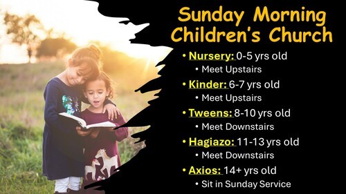 The Children remain in worship with their parents, and then will be released prior to the Sunday message.